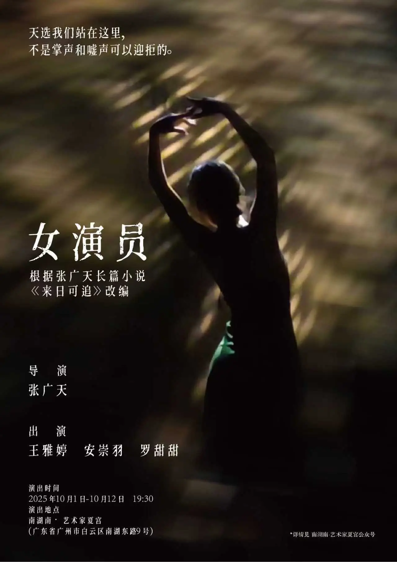 10月1日至12日,由作者、戏剧家张广天握导的最新舞台剧作品《女演员》将在广州南湖南·艺术家夏宫迎来首轮公演。该剧改编自其长篇演义《过去可追》第二辑第二章《没膝的卷耳令你昏醉》,是继《火车》《你》《玫瑰屋》《尤佳》后该系列推出的第5部“作品现场”,自创排以来便激发业内热心。