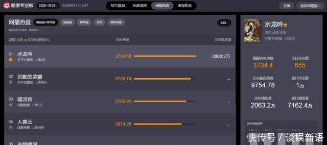 截至10月25日,11时13分,从“猫眼专科版”及时数据清楚可知,现时热播电视剧中,网播热度最高的五部剧差异如下: 1、《水龙吟》 主演:罗云熙/肖顺尧/敖子逸 剧情点评:《水龙吟》投资众多肉眼可见的落到实处,制作水准渊博,立意纯粹梵学,剧情新颖独到魔幻立异,服化谈中原好意思学极具艺术性好意思感,殊效顶级高能燃炸妩媚,主演演技颜值杠杠的,威望豪华,全员是俊男靓女有颜值有实力的,剧情更是强剧情快节拍真理带感,全主见的无短板,太顶了!何况罗云熙能把这么的扮装独霸成这么属实给我颠簸住了,弹琵琶的画面我能当壁纸,还有画面配景作念的稀薄细致,金叶寺的庭院配景、蟾光下的光影落幕,松驰一截皆能当背景图。是以总的来说,这么的剧集质料如故可圈可点,笃信此剧必爆!