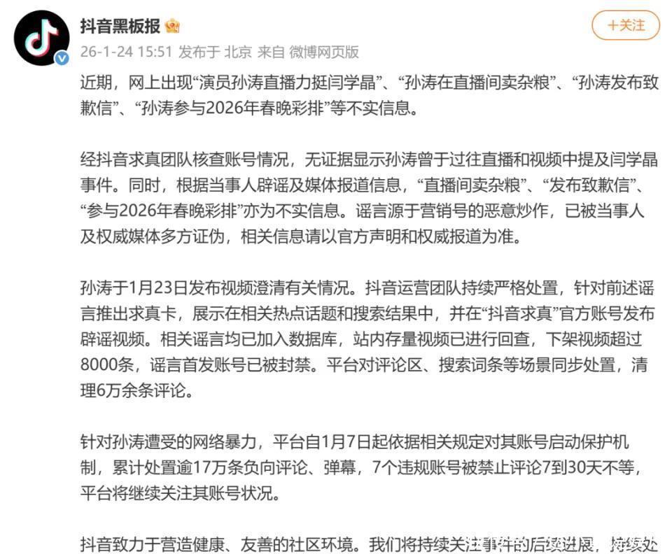 抖音平台随后介入科罚,下架视频升迁8000条,算帐6万余条指摘,并对孙涛账号初始保护机制。但伤害依然变成,谣喙转发量升迁2亿次,负面指摘高达17万条。