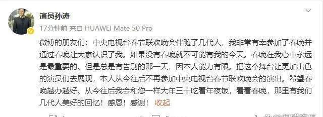 “从今往后,我就不再上中央电视台春节联欢晚会了。”1月26日,演员孙涛在视频中放心地说说念。这位18次登上春晚舞台的“常青树”,用“个东说念主才调有限”和“年岁渐长”的原理,为我方的春晚糊口画上了句号。