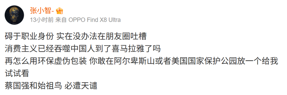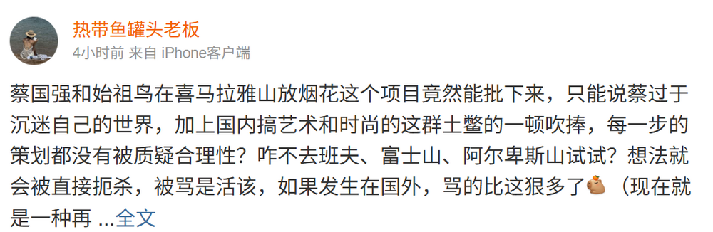 还有网友示意,碍于我方的劳登程份,着实没意见在一又友圈吐槽,滥用主见也曾吞吃中国东说念主到了喜马拉雅了吗?再奈何用环保极端包装,你敢在阿尔卑斯山大要好意思国国度保护公园放一个给我碰荣幸?蔡国强和鼻祖鸟必遭天谴。
