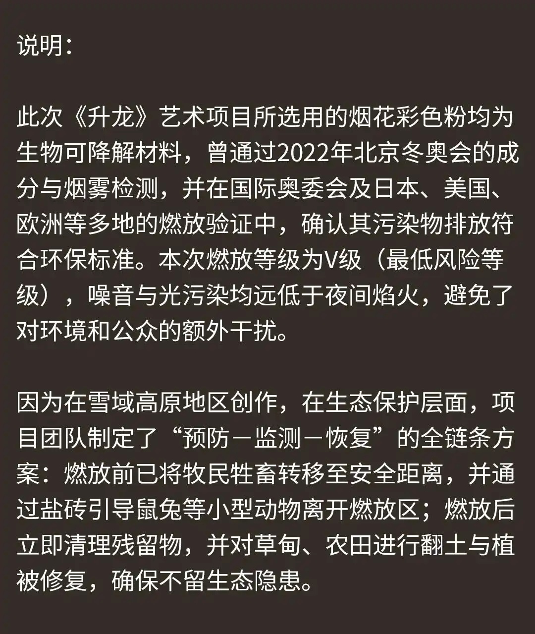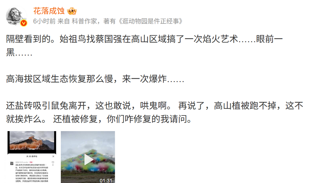 主持方称,这次《升龙》艺术神情充分酌量了环保。但该举止仍引起宽广争议。微博上闻明科学科普博顾主有容合计,鼻祖鸟×蔡国强炸山这个事,推崇出来的无知和显示也曾到了令东说念主发指的过程。说达到排放范例:蔡之前的作品大多在城市隔邻,排放范例和青藏高原的生态脆弱区能雷同?环评作念了吗?线路和批文在那处?