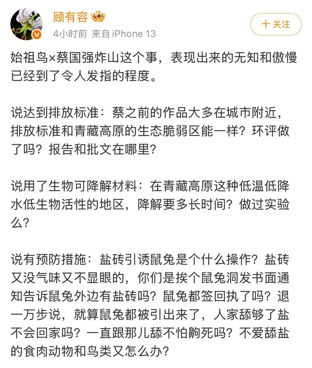 说用了生物可降解材料:在青藏高原这种低温低降水低生物活性的地区,降解要多万古分?作念过实践么?说有退守步调:盐砖指引鼠兔是个什么操作?盐砖又没气息又不显眼的,你们是挨个鼠兔洞发书面告知告诉鼠兔外边有盐砖吗?鼠兔皆签回持了吗?退一万步说,就算鼠兔皆被引出来了,东说念主家舔够了盐不会回家吗?一直跟那儿舔不怕齁死吗?不爱舔盐的食肉动物和鸟类又奈何办?