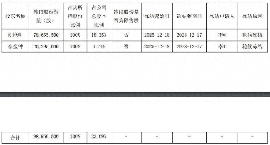12月22日,亚士创能(603378)发布公告凯时体育游戏app平台,控股鼓励上海创能明投资有限公司及本色法例东谈主李金钟所有所握的整个9895万股被轮候冻结,占公司总股本的23.09%。
