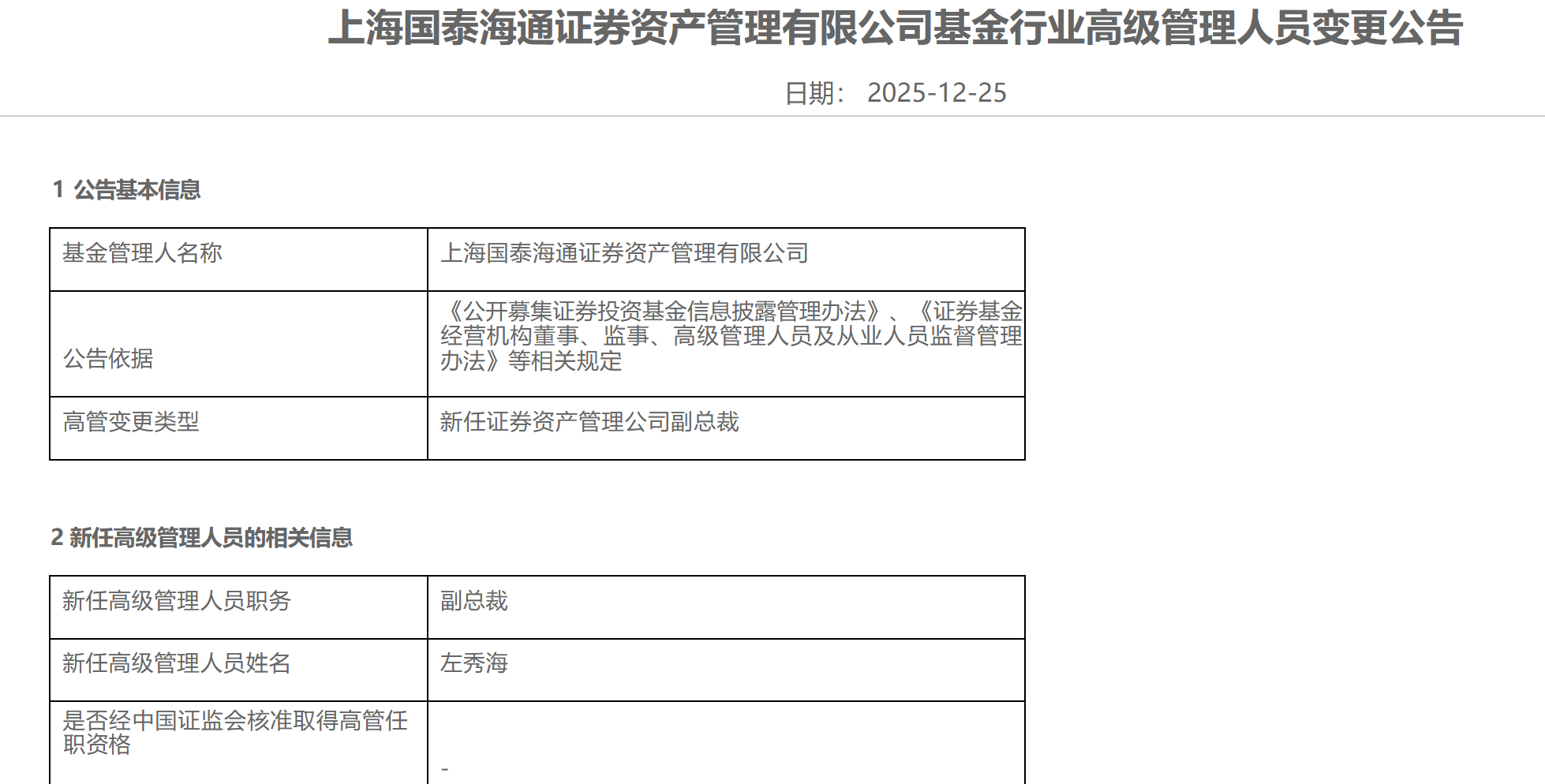 12月25日,国泰海通资管发布高档处治东说念主员变更公告,晓谕遴聘左秀海为公司副总裁,任职日历自2025年12月24日起。
